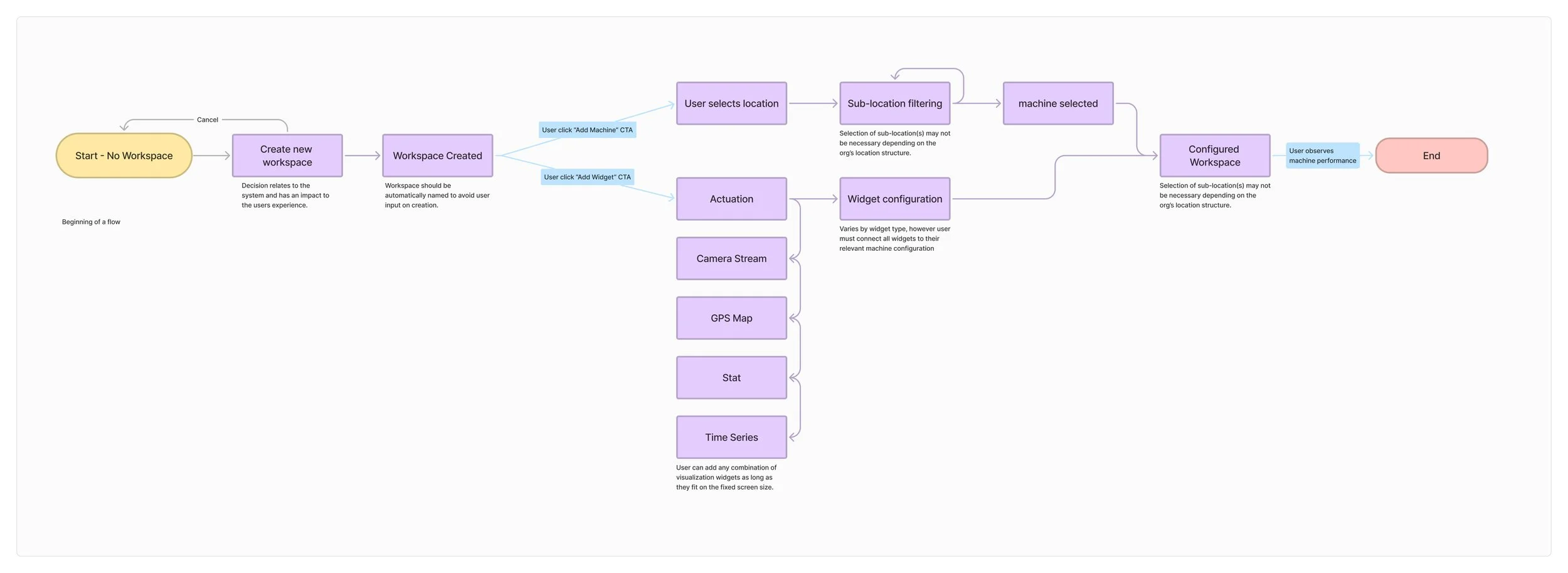 I mapped out the core user journeys for different personas, including solutions engineers and developers. Early flows prioritized quick access to machine status, streamlined manual control interactions, and fallback paths for degraded network environments.