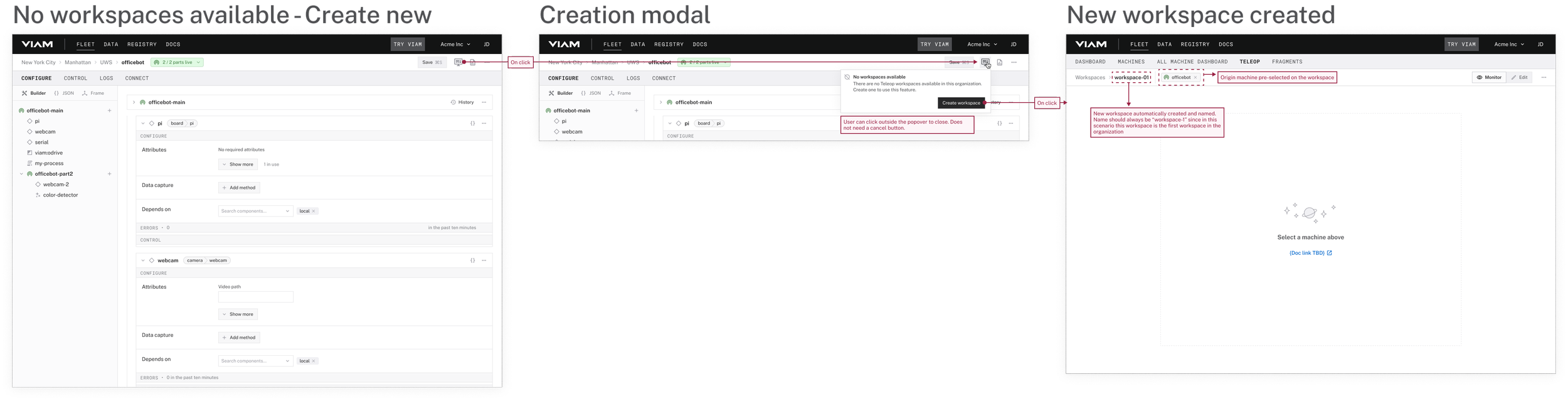 The testing also surfaced the need to create a new workspace from an existing machine. To allow easy interoperability between a live machine and a teleop workspace we wanted to add functionality to allow users to easily switch views without needing to go through high-level navigation to get there.